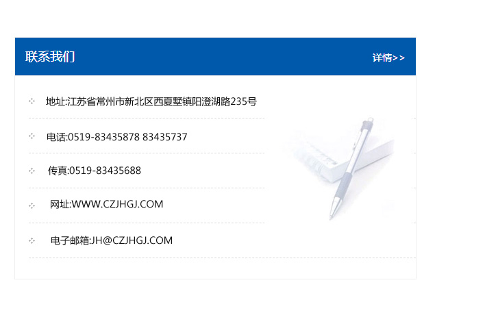 地址:常州市新北區友邦商務大廈1幢16、17層  電話:0519-85101652  傳真:0519-85112595  郵編:213022  網址:www_cz-jiayue_cn.kyk167.com  郵箱:xiajifengaa@163.com